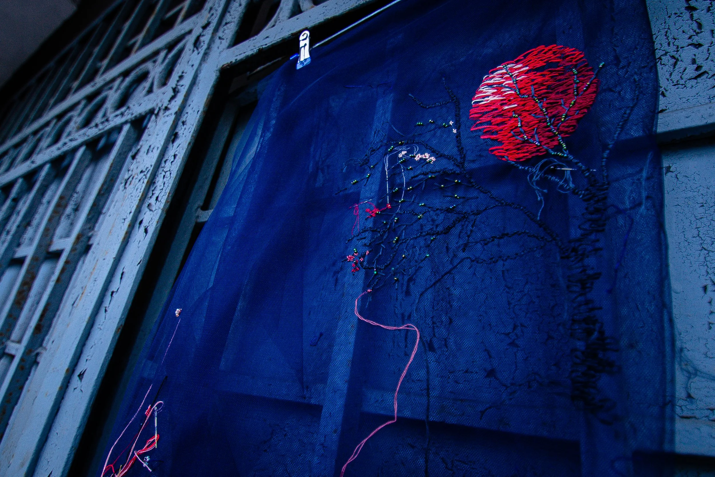 Thread chose me. After years of searching through oil, ink, resin, metal — it was the humblest material that held everything. It took time to trust this language. To stop apologizing that it wasn't "painting" or "graphics." Now I know: the slowness is the point. In a world that demands speed, image, instant consumption, I ask viewers to stop. To look at one stitch. To feel time made physical.